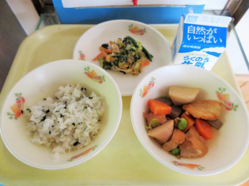今日のメニュー ゆかりごはん、さつま汁、ホキ天玉あげ、小松菜のいためもの、牛乳