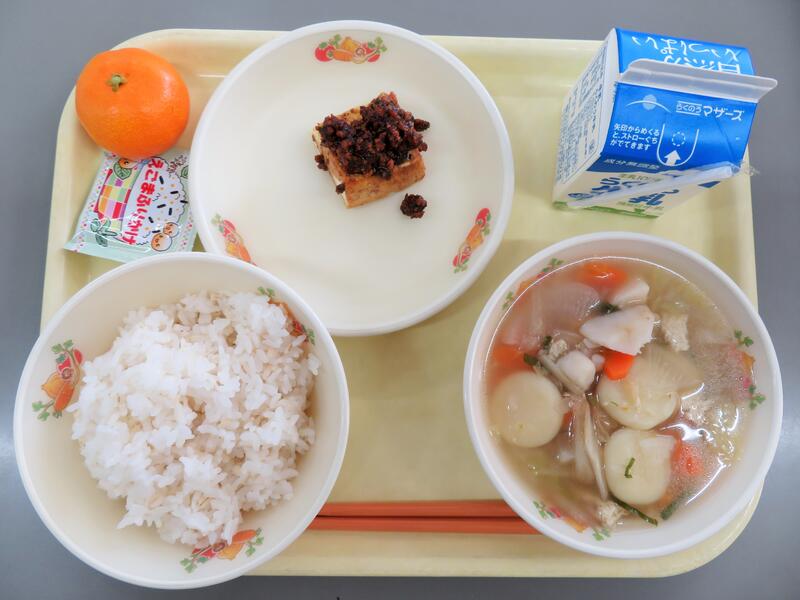 豆腐の田楽は、一年に一回給食に登場するメニューです。田楽は、とうふやこんにゃく、さといもやなすなどの具材に、調味したみそをつけて焼いた料理のことです。地方によって「田楽焼き」や「みそ田楽」とも呼ばれています。みそには、木の芽やゆずなどを加えることもあります。田楽はみそをつけてから焼く料理なのですが、みそをつけて焼くとこげやすいので、今日の豆腐の田楽は、オーブンで焼いたあつあげに、とりミンチが入った肉みそをつけてあります。少し甘めの肉みそは、ごはんにもよく合いますよ!肉みそも残さず食べてくださいね!