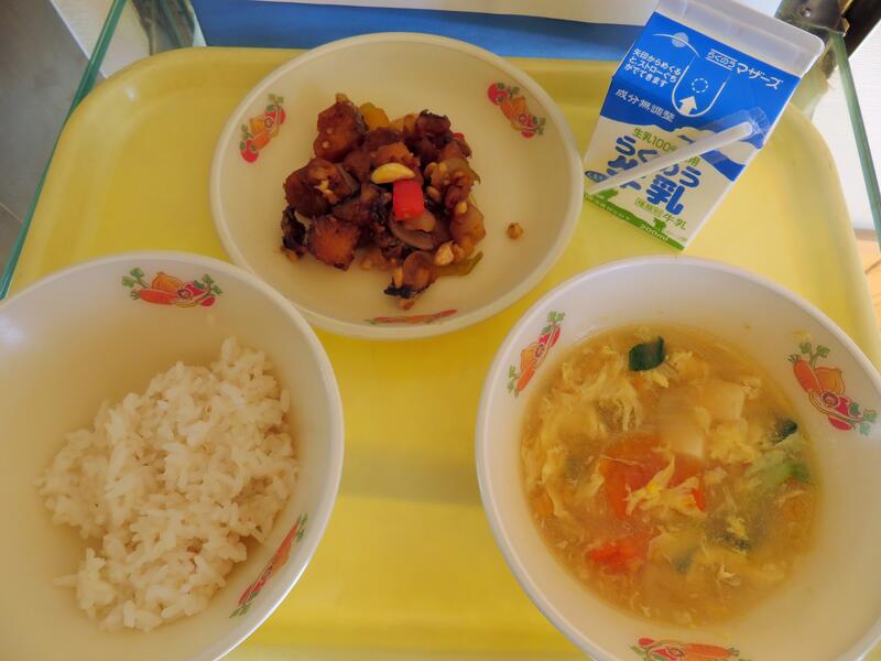 今日のメニュー 麦ごはん、スーミータン、魚と高野豆腐のナッツあえ、牛乳