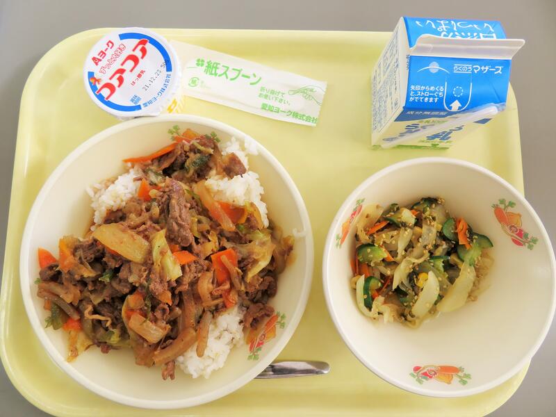 今日のメニュー 焼肉丼、高菜和え、ヨーグルト、牛乳