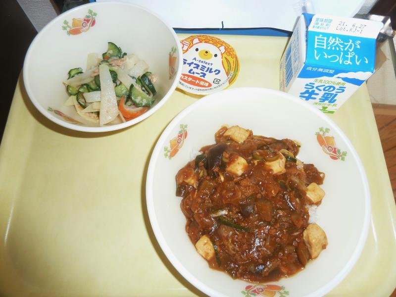 マーボーなす丼、じゃがいものシャキシャキサラダ、牛乳