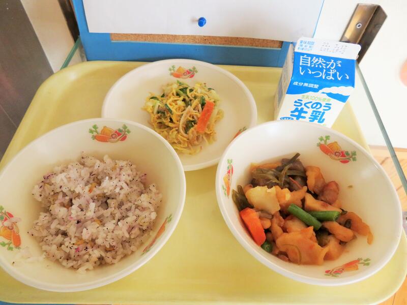 今日のメニュー 梅ちりごはん、大豆のいそ煮、きゃべつの酢の物、牛乳