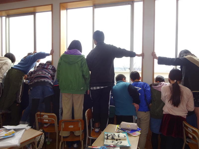 ↓ 6年生の教室に向かって在校生が大合唱 ↓教室の下を見てびっくりの6年生