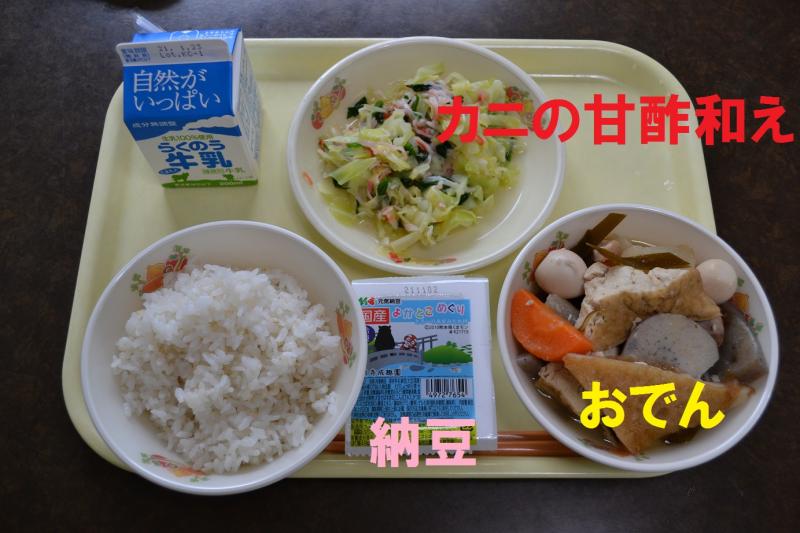 今日(1/12)の給食は、麦ごはん、おでん、カニの甘酢和え、納豆、牛乳でした。