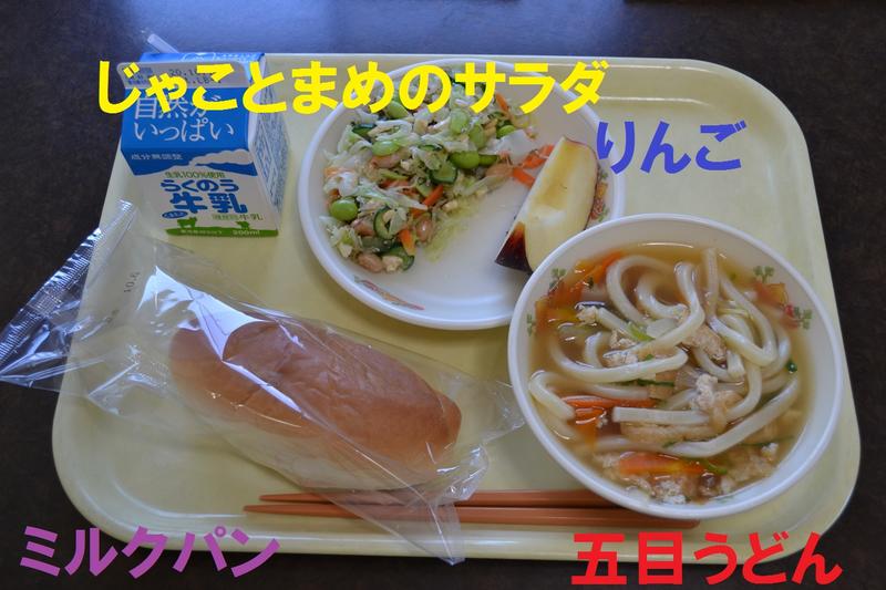今日のメニューの一番人気は、五目うどんでした。五目とはありますが、具だくさん(あげ、シイタケ、ネギ、鶏肉、にんじん、タマネギ、ちくわ、天かす)が入っていて、それぞれからおいしい出汁が出ていてスープのおいしことおいしいこと、びっくりしました。うどんの本場香川でも勝負できそうな味でした。じゃことまめのサラダは、低学年の子どもたちはちょっぴり苦戦していました。どうもまめが苦手のようです。キャベツ、きゅうり、にんじん3種類ほどの豆にカシューナッツを砕いたものも入れてあり、コールスロードレッシングで和えてありました。とてもおいしかったのですが・・。秋休みにでもご家庭で豆料理で豆のおいしさを体験させていただくとありがたいです。