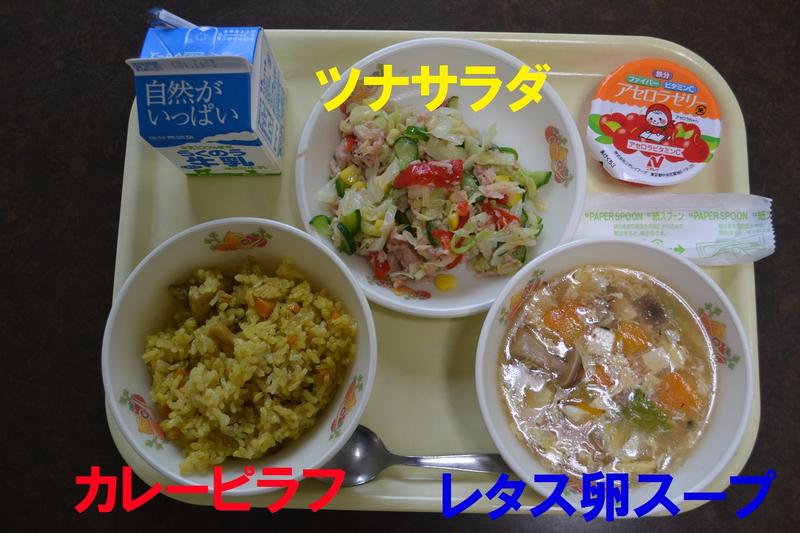 今日の給食は、カレーピラフ、レタス卵スープ、ツナサラダ、アセロラゼリー、牛乳でした。