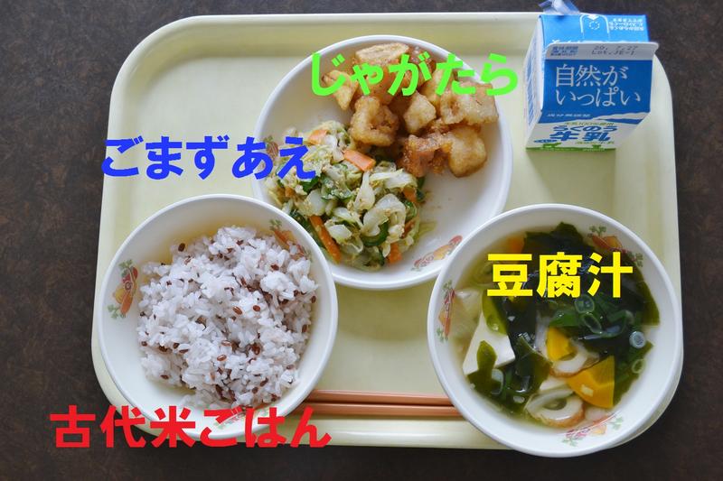今日の給食は、古代米ごはん、豆腐汁、じゃがたら、ゴマ酢和え、牛乳でした。