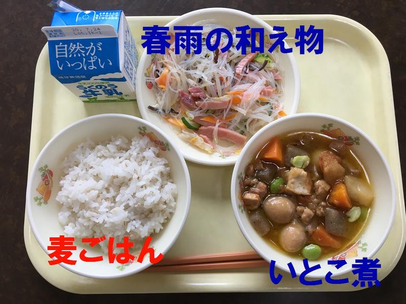 今日の給食は、麦ごはん、いとこ煮、春雨の和え物、牛乳でした。