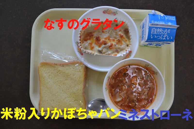 今日の給食は、米粉入りかぼちゃパン、ミネストローネ、なすのグラタン、牛乳でした。