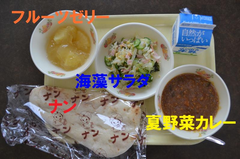 今日の給食は、ナン、夏野菜カレー、海藻サラダ、フルーツゼリー、牛乳でした。