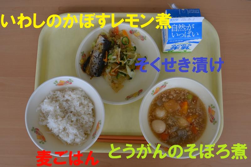 今日の給食は、麦ごはん、とうがんのそぼろ煮、いわしのかぼすレモン煮、そくせき漬け、牛乳でした。