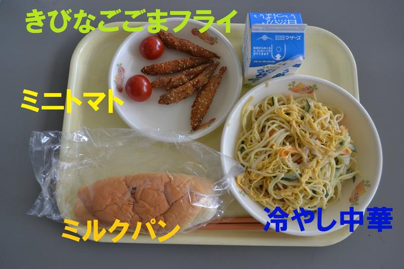 今日の給食は、ミルクパン、冷やし中華、きびなごフライ、ミニトマト、牛乳でした。