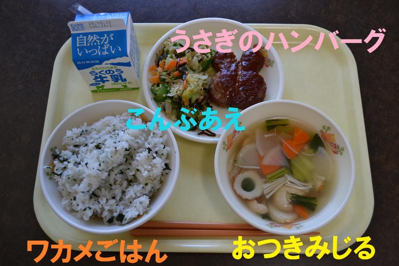 今日の給食は、ワカメごはん、お月見汁、うさぎのハンバーグ、昆布和え、牛乳でした。