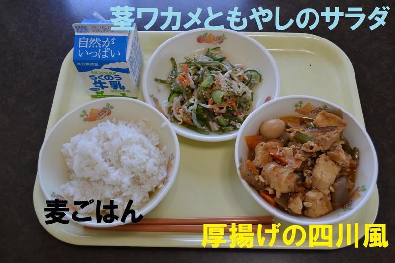 今日の給食は、むぎごはん、厚揚げの四川風、茎ワカメともやしのサラダ、牛乳でした。
