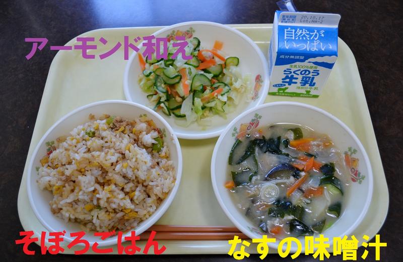 今日の給食は、そぼろごはん、なすの味噌汁、アーモンド和え、牛乳でした。