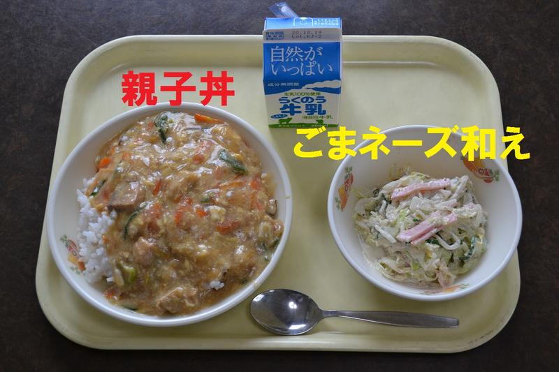 今日(10/8)の給食は、親子丼、こまネーズ和え、牛乳でした。
