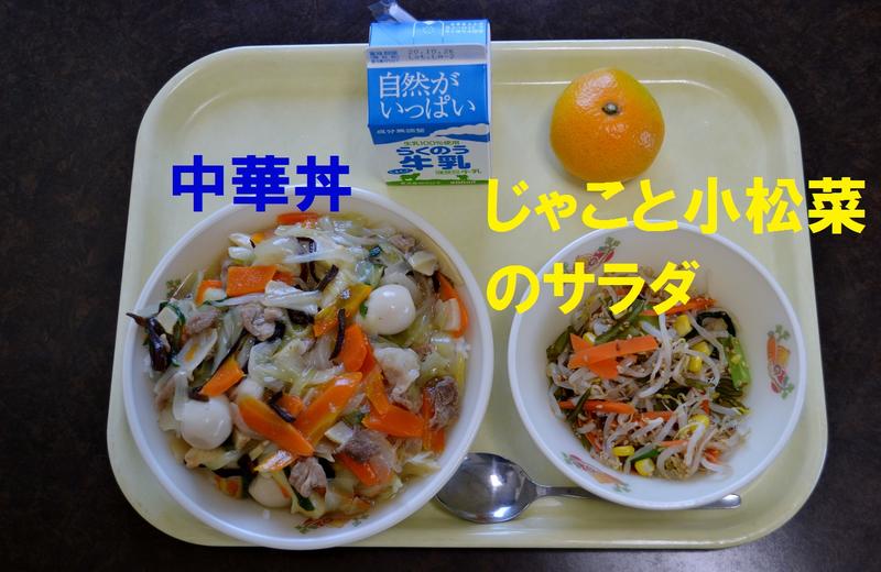 今日(10/15)の給食は、中華丼、じゃこと小松菜のサラダ、みかん、牛乳でした。