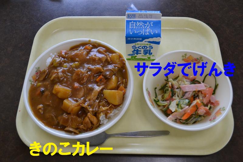 今日(10/19)の給食は、きのこカレー、サラダで元気、牛乳でした。