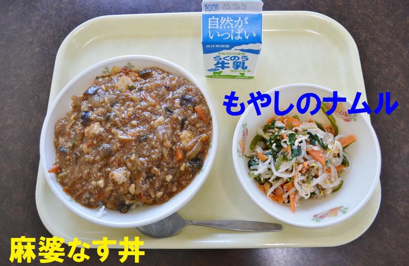 今日(10/20)の給食は、マーボーなす丼、もやしのナムル、牛乳でした。