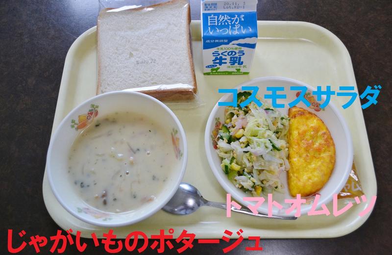 今日(10/23)の給食は、食パン、リンゴジャム、じゃがいものポタージュ、トマトオムレツ、コスモスサラダ、牛乳でした。
