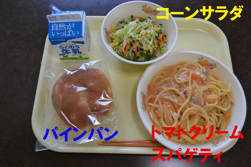 トマトクリームスパゲティーは、とてもとてもクリーミーでトマトの優しい味の部分が全面にでていました。ナポリタンやミートスパゲティとはちがうトマトの味でした。こんなのが給食で食べられるなんてと勝手に感動していました。コーンサラダは、コーンの他にも具だくさんでした。じゃこの風味に加え、塩、みりん、醤油、油を組み合わせた調理員さん秘伝のドレッシングの味でした。給食の調理員さんたちの腕前に驚かされた給食メニューでした。