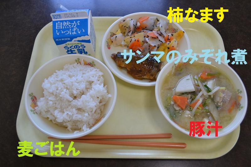 今日(10/29)の給食は、麦ごはん、豚汁、サンマのみぞれ煮、柿なます、牛乳でした。