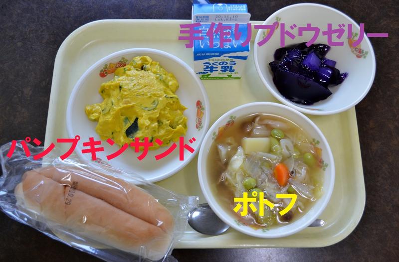今日はハロウィンです。これにちなんでカボチャが献立に使われました。カボチャをゆでてすりつぶし、マヨネーズで味付けしてありました。きゅうりもいれてあり、食感もよくパンにはさんでいただきました。カボチャの風味がたっぷりでおいしくいただきました。デザートには手作りブドウゼリー用意され、まさに気分はハロウィン!(しかしいたずらはしないでくださいね。)ポトフは具だくさんで温かく、おいしかったですよ。