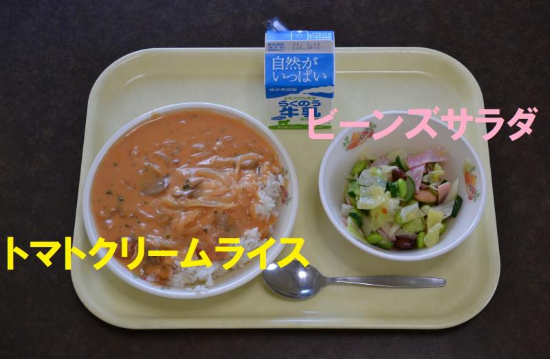 今日(3/1)の給食は、トマトクリームライス、ビーンズサラダ、牛乳でした。
