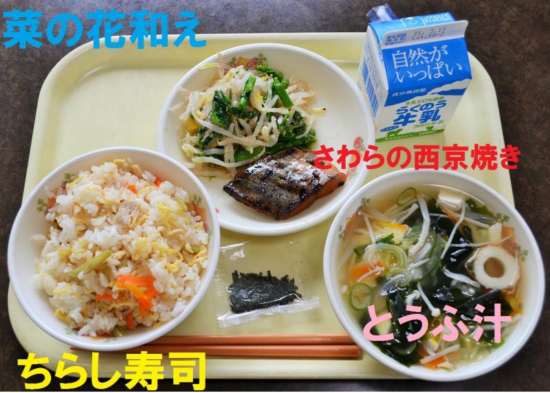 今日(3/2)の給食は、ちらし寿司、とうふ汁、さわらの西京焼き、菜の花の和え物、牛乳でした。