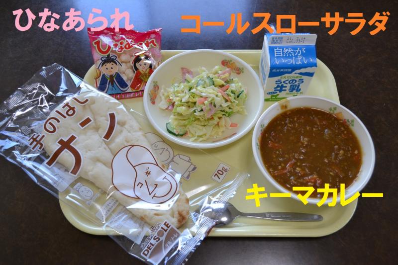 今日(3/3)の給食は、ナン、キーマカレー、コールスローサラダ、ひなあられ、牛乳でした。