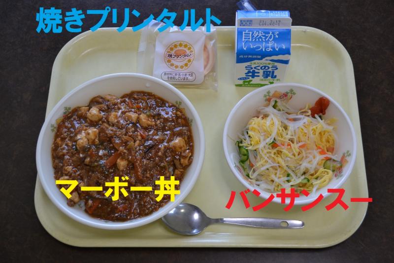 今日(3/8)の給食は、マーボー丼、バンサンスー、焼きプリンタルト、牛乳でした。学校のマーボー丼には、とうふの他、豚のひき肉、大豆ミートも使ってありました。大豆の栄養がたくさん入った栄養満点のメニューです。大豆ミートの食感は、ひき肉と似ているので気づかずに食べている人がほとんどだと思います。低カロリーで栄養満点、豆嫌いな人にもおいしく食べられる大豆ミートはとても注目の食材です。ご家庭でも是非利用してほしいと思います。バンサンスーは漢字で書くと「伴三糸」です。「伴三糸」とは、「千切りにした3つの材料と春雨の和え物」という意味です。もやし、錦糸たまご、焼き豚が千切りされていました。使う調味料は、酢、うすくちしょうゆ、砂糖、塩、ごま油だそうです。さっぱりしていながらもごま油の風味で食をそそりました。春雨も麺にすこし腰があってつるんとしていて食感もとてもよかったです。焼きプリンタルトも付いて満足の給食でした。