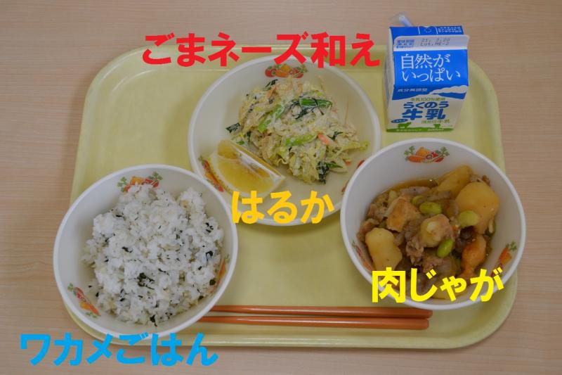 ほんのり塩味のワカメごはんだけでもおいしいのに、ほくほくのじゃがいもにお肉もたっぷり入った肉じゃががさらに食欲をそそりました。ごまネーズ和えもごまの風味でこれもまた食欲をそそりました。はるかは旬です。甘かったです。