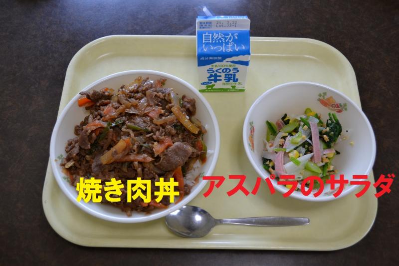 今日(3.11)の給食は、焼き肉丼、アスパラのサラダ、牛乳でした。