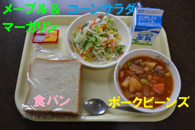 今日(3/12)の給食は、食パン、メープル&マーガリン、ポークビーンズ、コーンサラダ、牛乳でした。ポークビーンズは、豚肉と豆を主な材料としたトマト味の煮込み料理です。アメリカの代表的な家庭料理で、豚肉の代わりにベーコンが使われることもあります。いつも給食のポークビーンズには大豆を使いますが、今日は白いんげん豆を使ってありました。トマト味ですが、デミグラスソースや、塩、しょうゆなど様々な調理量で仕上げてあり柔らかく優しい味になっていました。コーンサラダは、キャベツやキュウリの食感のよさと糸かまぼこの食感が心地よく、味も5種類ほどの調味料がブレンドされたドレッシングでとてもおいしくいただきました。