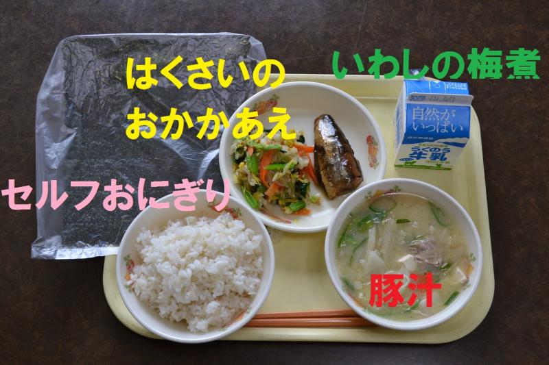 今日(3/15)の給食は、セルフおにぎり、豚汁、いわしの梅煮、白菜のおかか和え、牛乳でした。和食のメニューで、どれも食欲をそそりました。今日は、のりが追加されていて、私は、のりでごはんをまいて、それにいわしの梅煮を入れてみました。ぱりっとしたのりの食感に、ふっくら炊きあがった麦ごはん、そしていわしの梅煮の甘辛いたれも一緒に口の中でひろがり、おいしおいのなんの。ごはんと梅にだけで食べるのとはひと味もふた味も違っていました。いわしにはたくさんのカルシウムが含まれています。また、カルシウムの吸収を助けるビタミンDも豊富なので、成長期の子どもたちにはぴったりの食材です。白菜のおかか和えも、かつおの味付けがしっかいりていて、これも食欲をそそる一品でした。