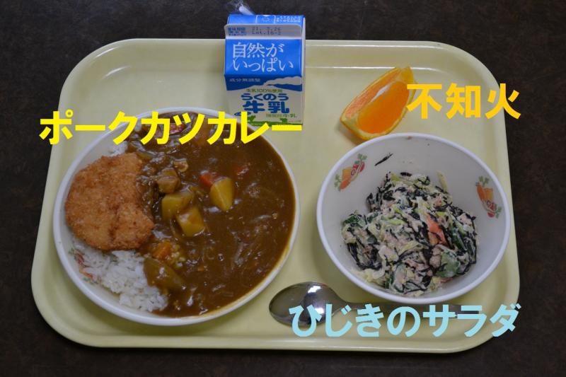 今日(3/16)の給食は、ポークカツカレー、ひじきのサラダ、不知火、牛乳でした。