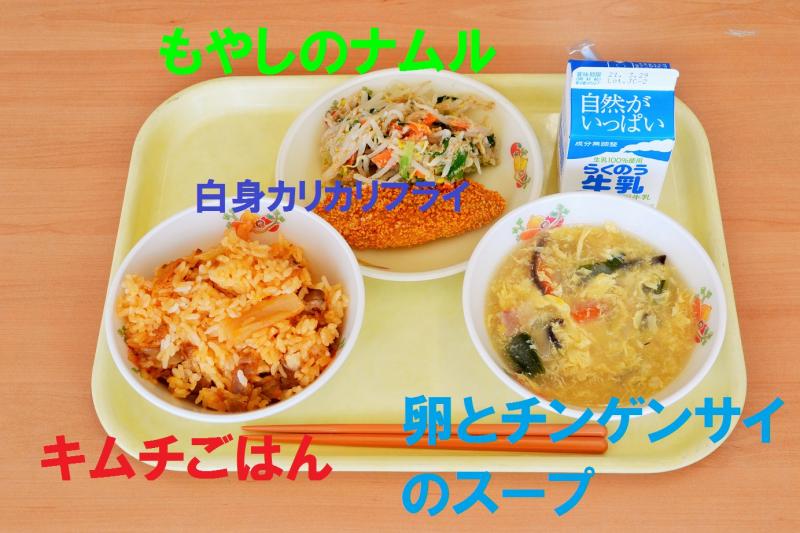 今日(3/18)の給食は、キムチごはん、卵とチンゲンサイのスープ、白身カリカリフライ、もやしのナムル、牛乳でした。キムチごはんのキムチは、白菜などの野菜に唐辛子や塩、魚介塩辛やニンニクなどを混ぜて作る漬け物です。キムチにはたくさんの乳酸菌が含まれています。この乳酸菌は、生きて腸まで届き、腸内の善玉菌を増やしてくれます。この善玉菌が腸内環境を整えていきます。免疫力も上げられるそうです。おいしく食べて健康になりましょう。