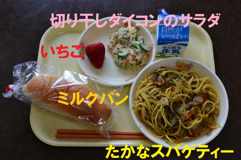今日(3/19)の給食は、ミルクパン、たかなスパゲティー、切り干しダイコンのサラダ、いちご、牛乳でした。今日のメニューはふるさとくまさんデー(阿蘇地区)となっていいて、阿蘇にちなんだ食材や料理がだされました。