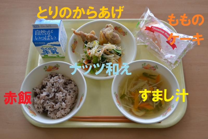 今日(3/22)の給食は、赤飯、すまし汁、とりの唐揚げ、ナッツ和え、もものケーキ、牛乳でした。そう、今日は今年度最後の給食で、6年生は明日が卒業式のためお祝い給食でした。六年生の皆さん卒業おめでとうございます。調理の松江先生は、この6年生が入学してきた時に北小に赴任されました。つまり、6年間今の6年生の給食を作り続けた事になります。この学年の皆さんは、残菜もなくとても良く給食を食べていたので、子どもらしく元気な学年という印象だったそうです。1年生がらの成長を見ることができてとてもうれしくかったということでした。きっと6年生は、最後の給食を味わって心に残して卒業していくと思います。