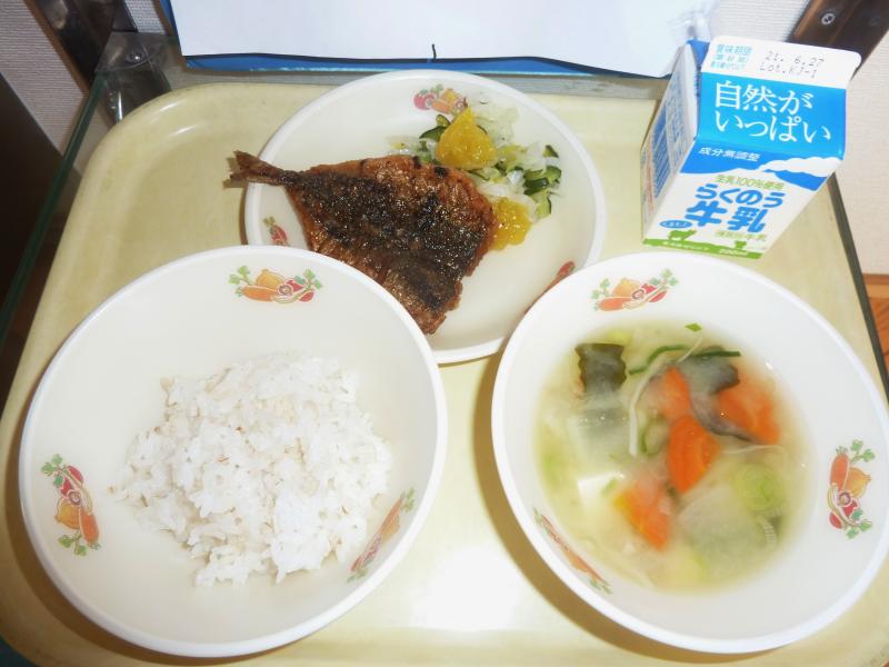今日のマダイのいそべ揚げは、令和2年度に「くまもとの食材提供推進事業」と同様、天草産のマダイを国からの補助金で提供していただける事業です。5月から7月の間に2回使うことができたので、今日と7月13日に予定しています。タイには、血中コレステロール値を低下させ血圧を正常に保つタウリンを豊富にふくんでいます。タウリンは、肉類にはほとんど含まれない成分で、心臓機能を強化する働きを持ちます。加えて、タイにはうまみの成分でもあるグルタミン酸やイノシン酸が多く含まれています。グルタミン酸やイノシン酸には、細胞の再生を促進する効果もあります。天草産のマダイを感謝していただきましょう!