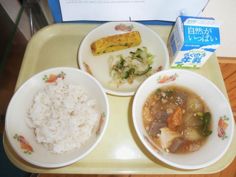 今日のメニュー 麦ごはん、冬瓜のそぼろ煮、千草焼、土佐酢和え、牛乳