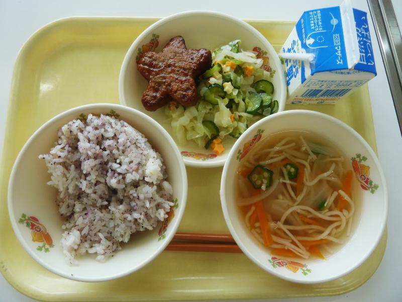 ゆかりごはん、七夕そうめん汁、星型ハンバーグ、チーズサラダ、牛乳
