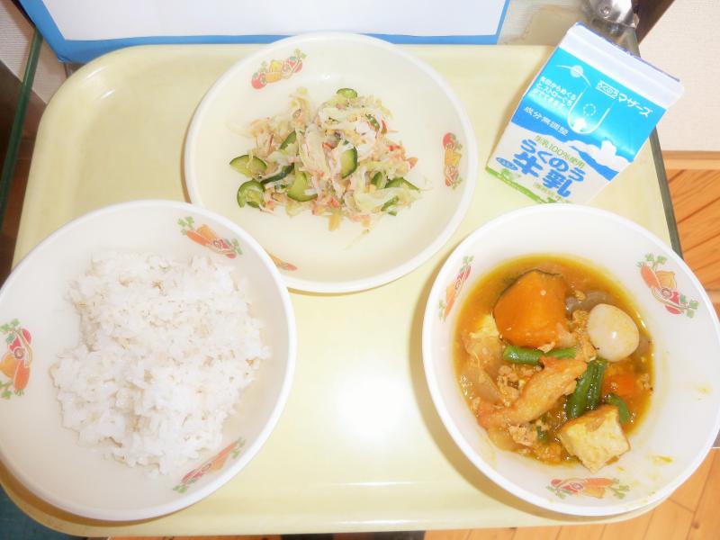 今日のメニュー 夏野菜カレーライス、フルーツヨーグルト、牛乳