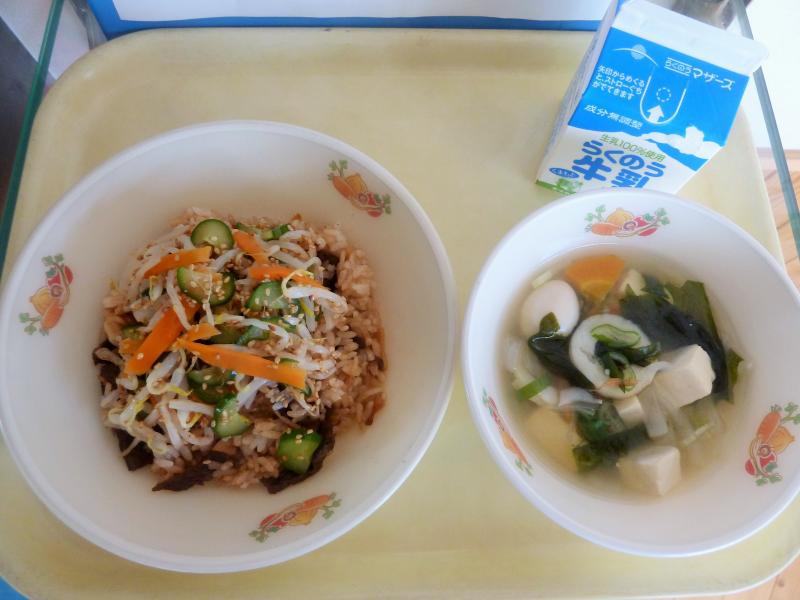 今日のメニュー ビビンバ、うずらとわかめのスープ、牛乳