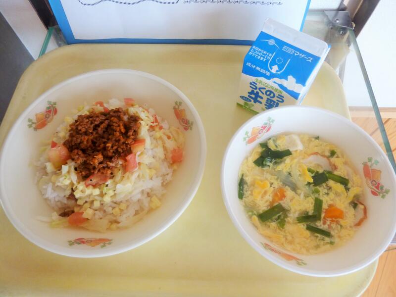 今日のメニュー タコライス、にら玉スープ、牛乳
