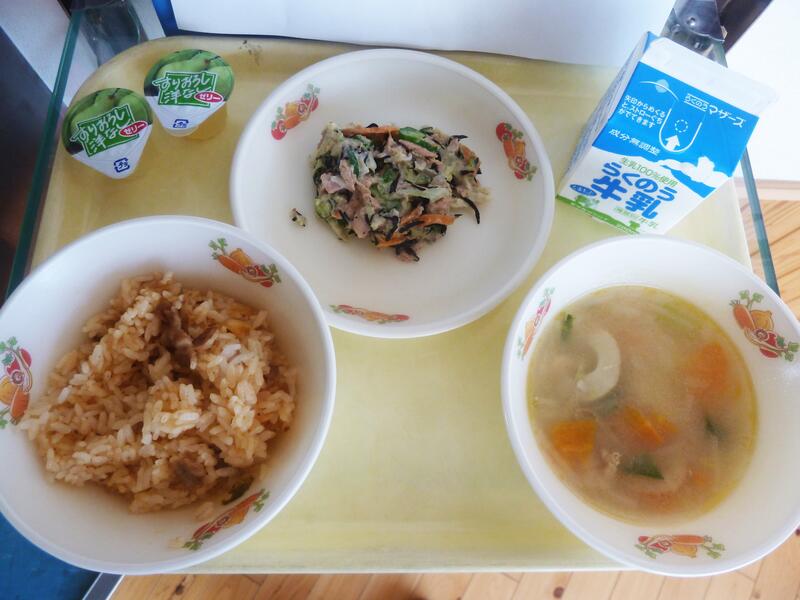 今日のメニューキムチごはん、ワンタンスープ、ひじきサラダ、ラフランスゼリー、牛乳