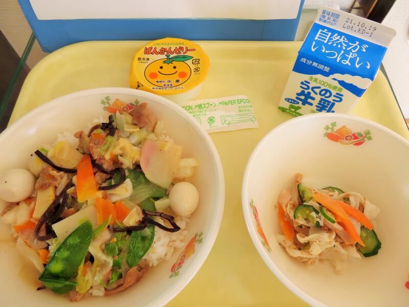秋休みも終わり、今日から後期の始まりですね。中華丼は、丼物のひとつで、「八宝飯」ともよばれ、ご飯の上に八宝菜をのせた料理のことです。これは、日本で生まれたもので、東京の中華料理店で昭和の初めごろ、お客さんから「ご飯に八宝菜をのせてほしい」とたのまれて作ったのが始まりだと言われています。そのため、中華という名前がつきますが、本場、中国には存在しない料理です。給食の中華丼は、豚肉、いか、えび、うずらの卵、人参、たまねぎ、白菜、たけのこ、きぬさや、きくらげ等、たくさんの具材が入って栄養たっぷりです!もりもり食べて、後期の学校生活もがんばりましょう!