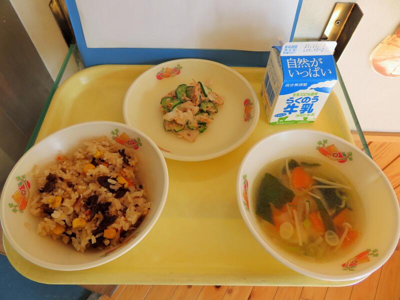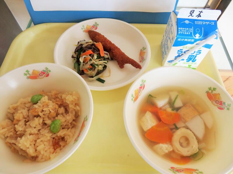 今日のメニュー お法師さんまぜごはん、いちょう葉汁、
