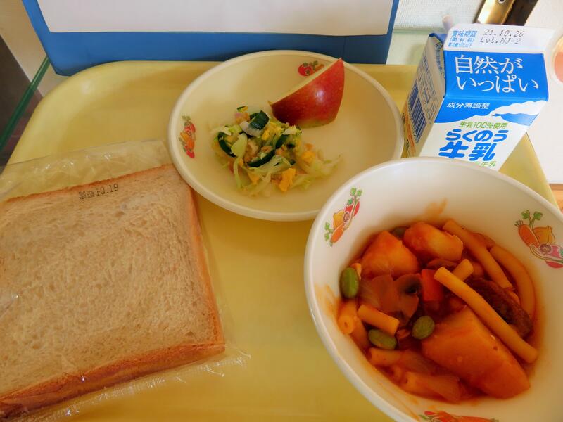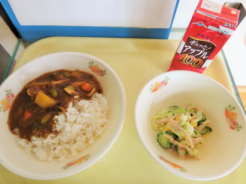 今日は、ノンアレルギーデーで北小の全員が同じ給食を食べられる日です。通常カレールゥには、アレルギー成分が含まれていますが、今日のカレールゥは、アレルギー成分を含まないものを使っています。森のきのこカレーは、しめじ、エリンギ、マッシュルームなどのきのこ類がたくさん入ったカレーです。 ほとんどの種類が秋に旬をむかえるきのこは、低カロリーでヘルシーなのに栄養満点の食材です。食物繊維が多いと言われる食材の中でも、きのこの食物繊維はトップクラスで、少量でおなかの調子を整えてくれます。ビタミンやミネラルも豊富で、ほかの食品に負けていません。きのこはとにかくスゴイんです!今日は、牛乳の代わりのりんごジュースも牛乳が苦手という人には嬉しいですね。今日は、大好きなカレーライスで楽しい給食の時間にしてくださいね!