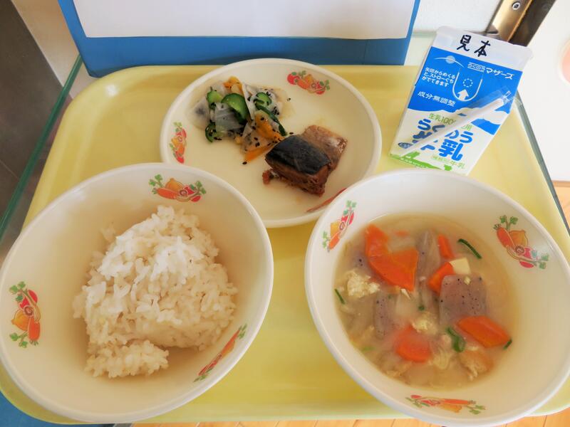 今日のメニュー 麦ごはん、けんちん汁、さばのしょうが煮、柿なます、牛乳